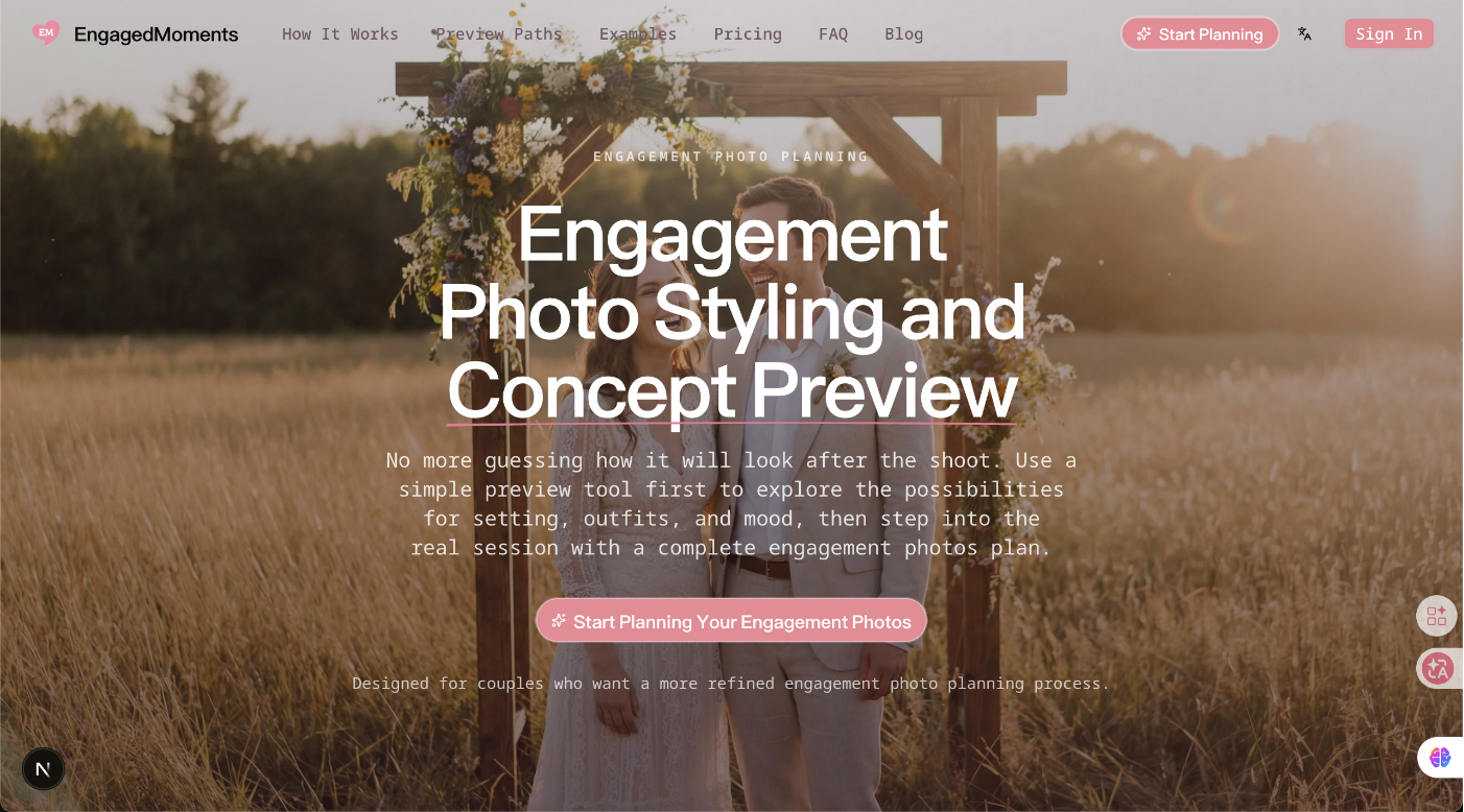 EngagedMoments 是做什么的、策划器怎么帮情侣确定订婚照方向,以及如何在正式拍摄前先预览灵感方案。